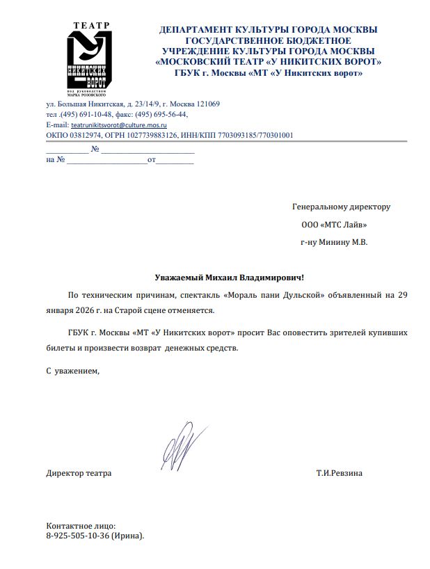 Уважаемый клиент! Спешим сообщить, что по информации, полученной от организатора, спектакль «Мораль пани Дульской», запланированный на 29 января 2026 года в театре «У Никитских ворот», отменен. Деньги за электронные билеты вернутся автоматически в полном объёме на карту, с которой была произведена оплата. Если вы купили билет в кассе Ticketland.ru за наличный расчет, то обратитесь, пожалуйста, на почту: vozvrat@ticketland.ru. С уважением, команда поддержки Ticketland