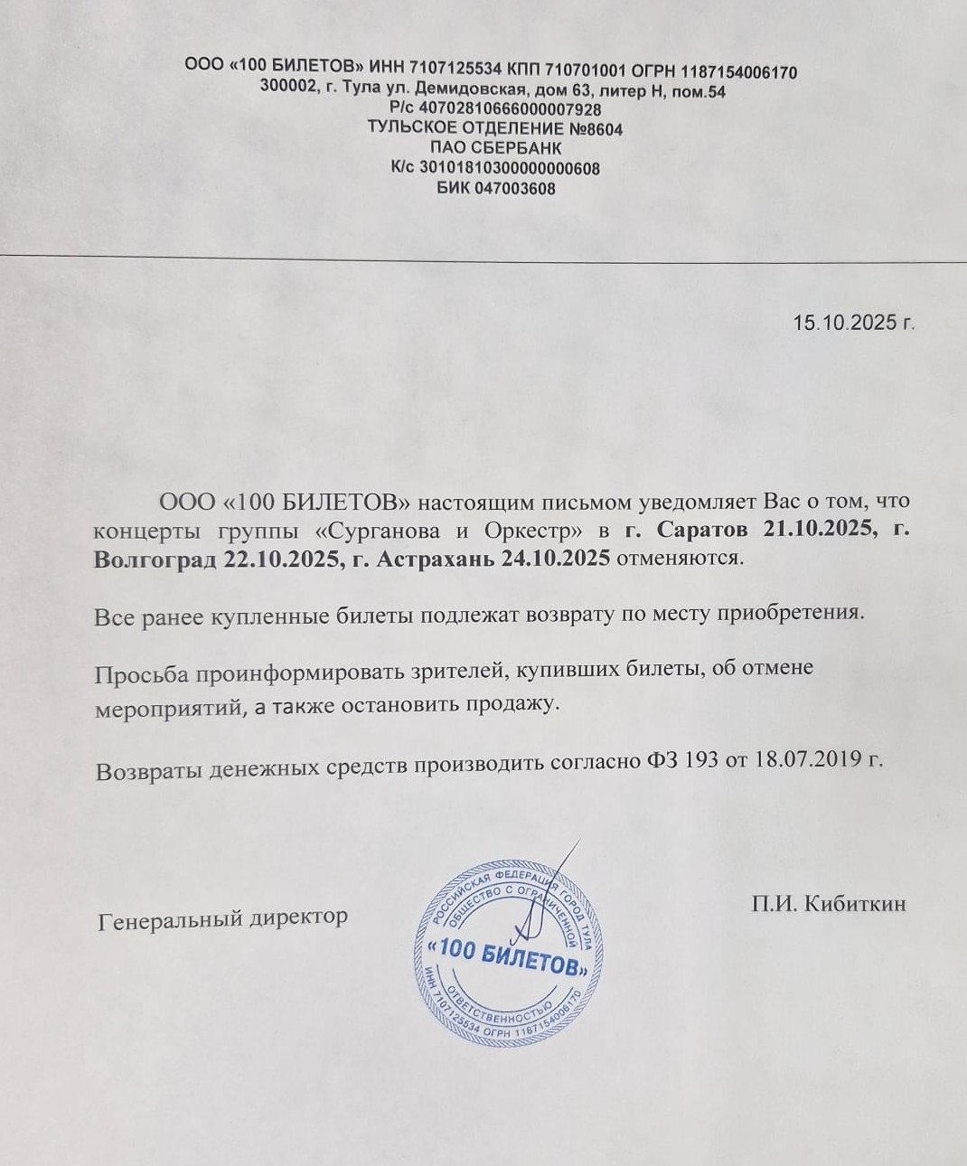 Уважаемый клиент! Спешим сообщить, что по информации, полученной от организатора, концерт группы «Сурганова и Оркестр», запланированный на 24 октября 2025 года в 19:00 в Астраханском дворце культуры «Аркадия», отменён. Деньги за электронные билеты вернутся автоматически в полном объёме на карту, с которой была произведена оплата. Если вы купили билет в кассе Ticketland.ru за наличный расчет, то обратитесь, пожалуйста, на почту: vozvrat@ticketland.ru. С уважением, команда поддержки Ticketland.