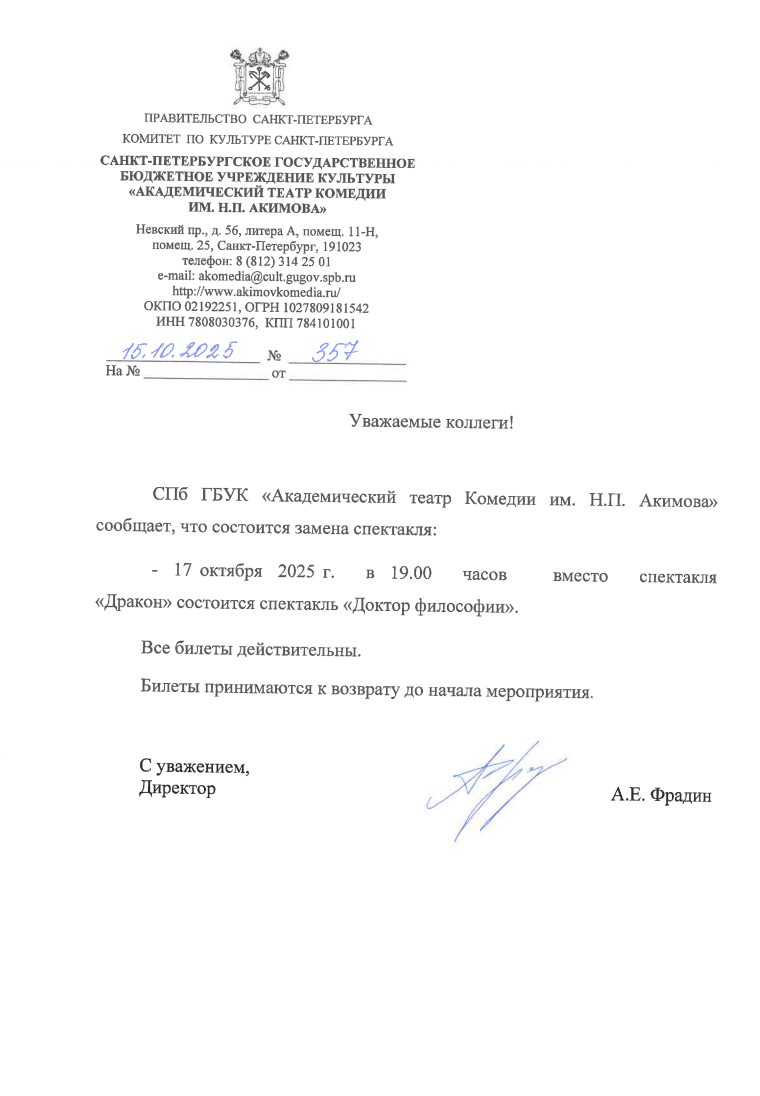 Уважаемый клиент! Спешим сообщить, что по информации, полученной от организатора, спектакль «Дракон», запланированный на 17 октября 2025 года в 19:00 в театре комедии им. Акимова, заменён на спектакль «Доктор философии». Ранее приобретенные билеты действительны на новое мероприятие, обменивать их не нужно. Если новое мероприятие вам не подходит, вы можете вернуть билет по кнопке в личном кабинете во вкладке «Заказы». Деньги за электронные билеты вернутся автоматически в полном объёме на карту, с которой была произведена оплата. Если вы купили билет в кассе Ticketland.ru за наличный расчет, то обратитесь, пожалуйста, на почту: vozvrat@ticketland.ru. С уважением, команда поддержки Ticketland.
