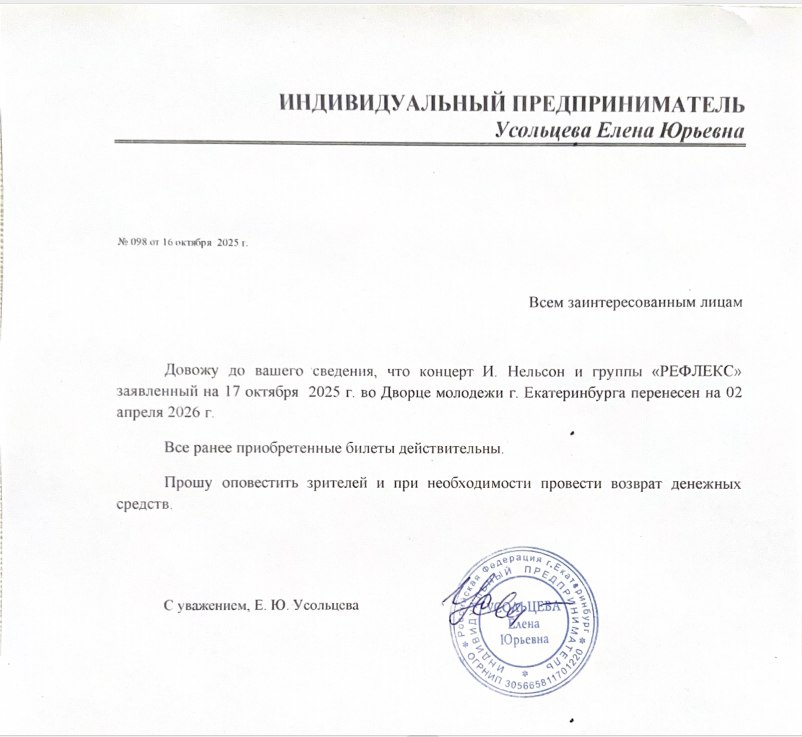 Уважаемый клиент! Спешим сообщить, что по информации, полученной от организатора, концерт Ирины Нельсон «Reflex», запланированный на 17 октября 2025г. во Дворце молодёжи, переносится на 02 апреля 2026г. в 19:00 во Дворце молодёжи. Ранее приобретенные билеты действительны на новую дату, обменивать их не нужно. Если вам не удобно посетить концерт в новую дату, вы можете вернуть билет по кнопке в личном кабинете во вкладке «Заказы». Деньги за электронные билеты вернутся автоматически в полном объёме на карту, с которой была произведена оплата. Если вы купили билет в кассе Ticketland.ru за наличный расчет, то обратитесь, пожалуйста, на почту: vozvrat@ticketland.ru. Письмо от организаторС уважением, команда поддержки Ticketland.