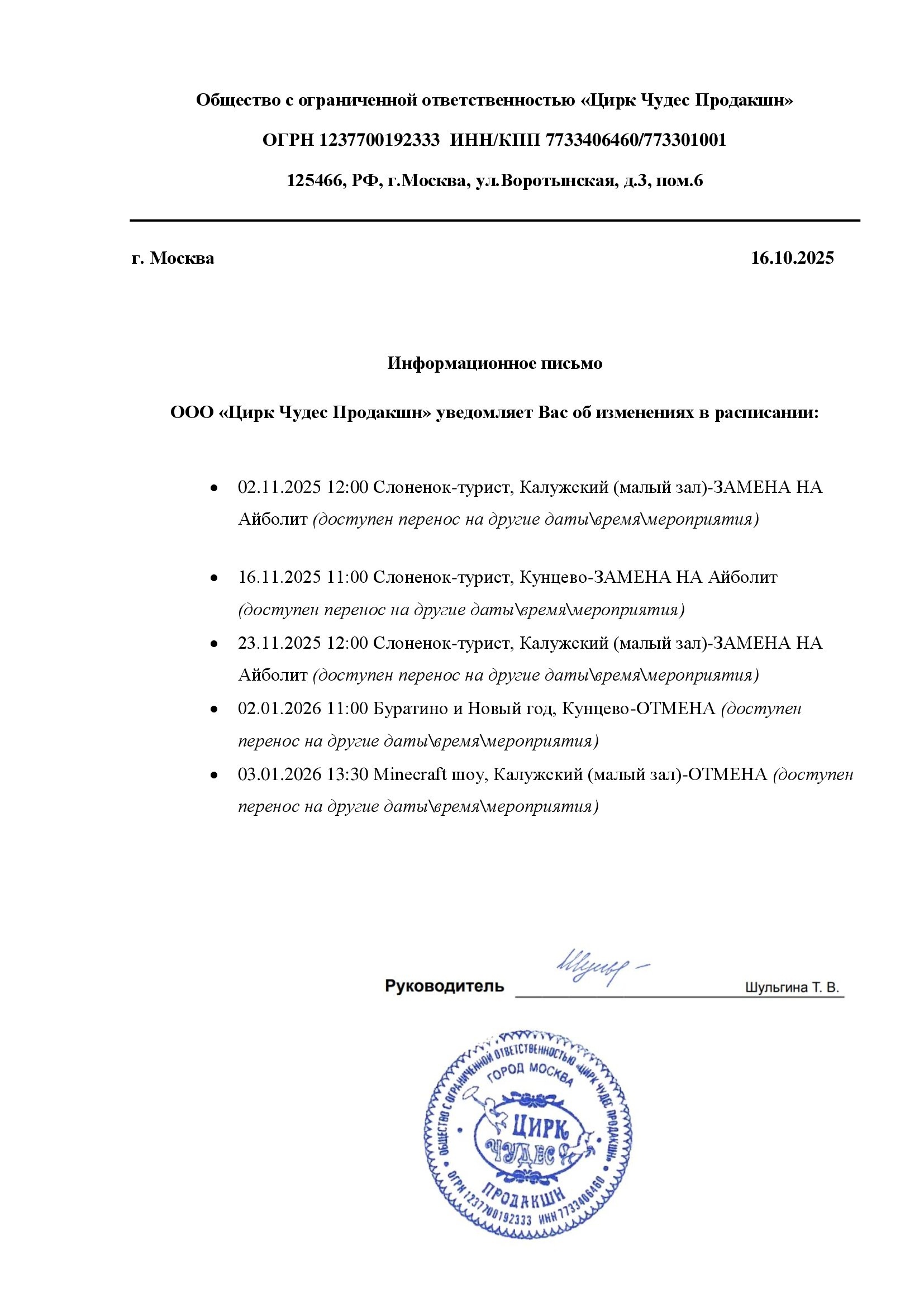 Уважаемый клиент! Спешим сообщить, что по информации, полученной от организатора, Minecraft шоу, запланированное на 3 января 2026 года в 13:30 в цирке чудес Калужский (КЦ «Меридиан»), отменено. Доступен перенос на другие даты/время/мероприятия. По вопросам возвратов и обменов, пожалуйста, обращайтесь к организатору мероприятия по тел. +7 (495) 445 49 45, или написав на почту office@aivengo-t.ru Письмо от организатораС уважением, команда поддержки Ticketland