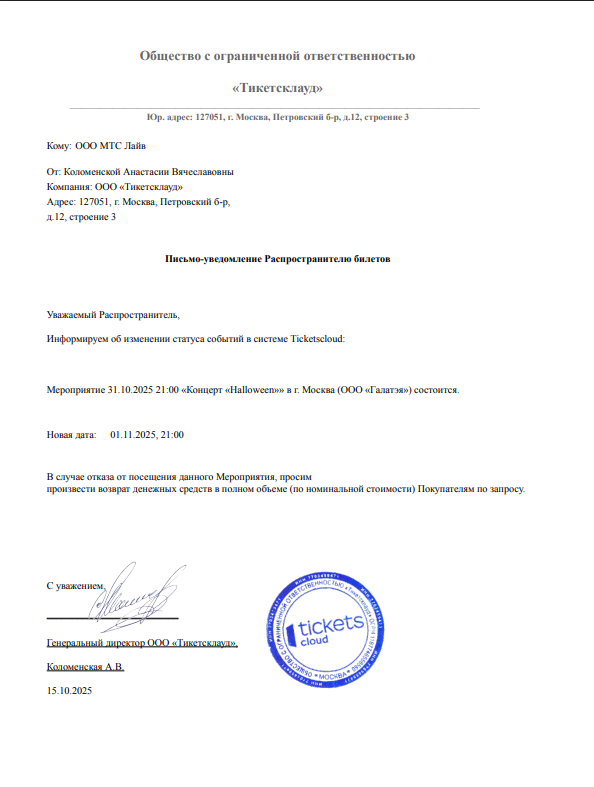 Уважаемый клиент! Спешим сообщить, что по информации, полученной от организатора, концерт «Halloween», запланированный на 31 октября 2025 года в 21:00 в Люмьер-Холле, перенесён на 1 ноября 2025 года, начало в 21:00. Ранее приобретенные билеты действительны на новую дату, обменивать их не нужно. Если вам не удобно посетить спектакль в новую дату, вы можете вернуть билет по кнопке в личном кабинете во вкладке «Заказы». Деньги за электронные билеты вернутся автоматически в полном объёме на карту, с которой была произведена оплата. Если вы купили билет в кассе Ticketland.ru за наличный расчет, то обратитесь, пожалуйста, на почту: vozvrat@ticketland.ru. Письмо от организатораС уважением, команда поддержки Ticketland.