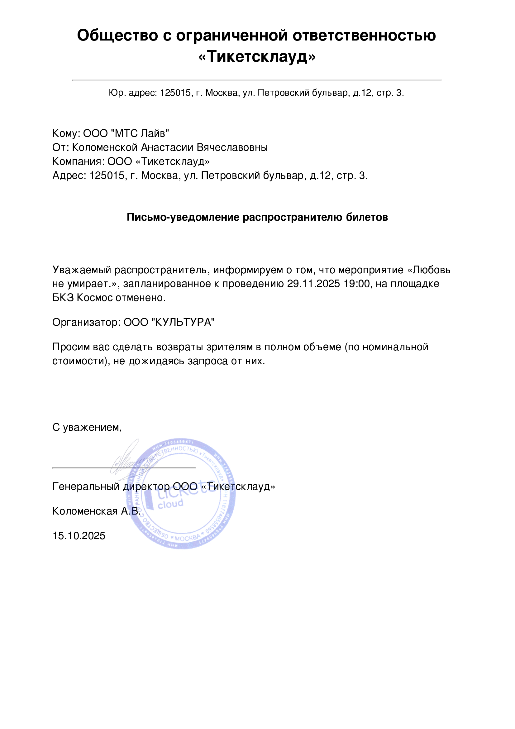 Уважаемый клиент! Спешим сообщить, что по информации, полученной от организатора, спектакль «Любовь не умирает», ранее запланированный 28 ноября и перенесенный на 29 ноября 2025 года в 19:00 в Большом концертном зале «Космос», отменён. Деньги за электронные билеты вернутся автоматически в полном объёме на карту, с которой была произведена оплата. Если вы купили билет в кассе Ticketland.ru за наличный расчет, то обратитесь, пожалуйста, на почту: vozvrat@ticketland.ru. С уважением, команда поддержки Ticketland.