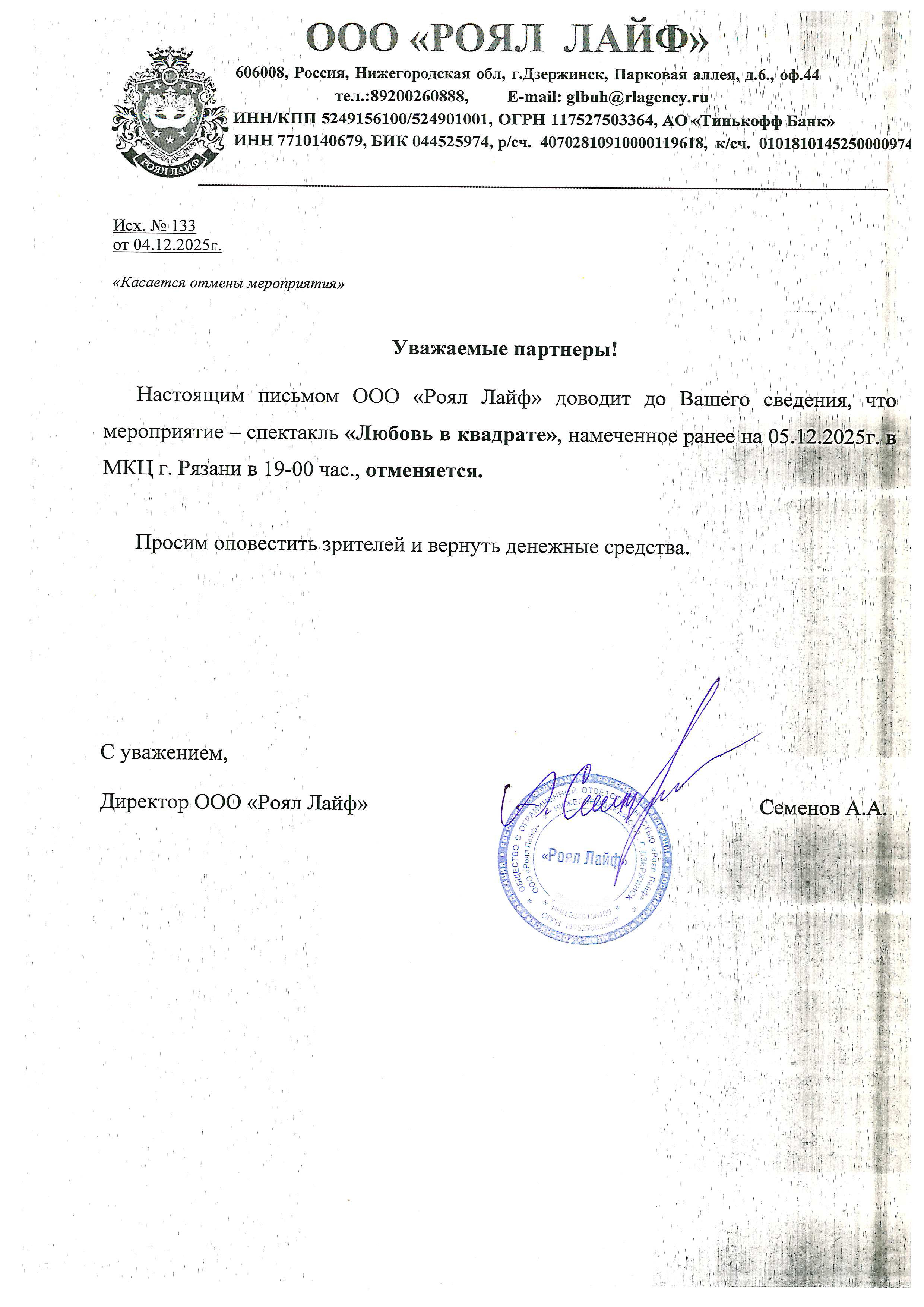 Уважаемый клиент! Спешим сообщить, что по информации, полученной от организатора, спектакль «Любовь в квадрате», запланированный на 5 декабря 2025 года в 19:00 в МКЦ «Рязань», отменён. Деньги за электронные билеты вернутся автоматически в полном объёме на карту, с которой была произведена оплата. Если вы купили билет в кассе Ticketland.ru за наличный расчет, то обратитесь, пожалуйста, на почту: vozvrat@ticketland.ru. С уважением, команда поддержки Ticketland.