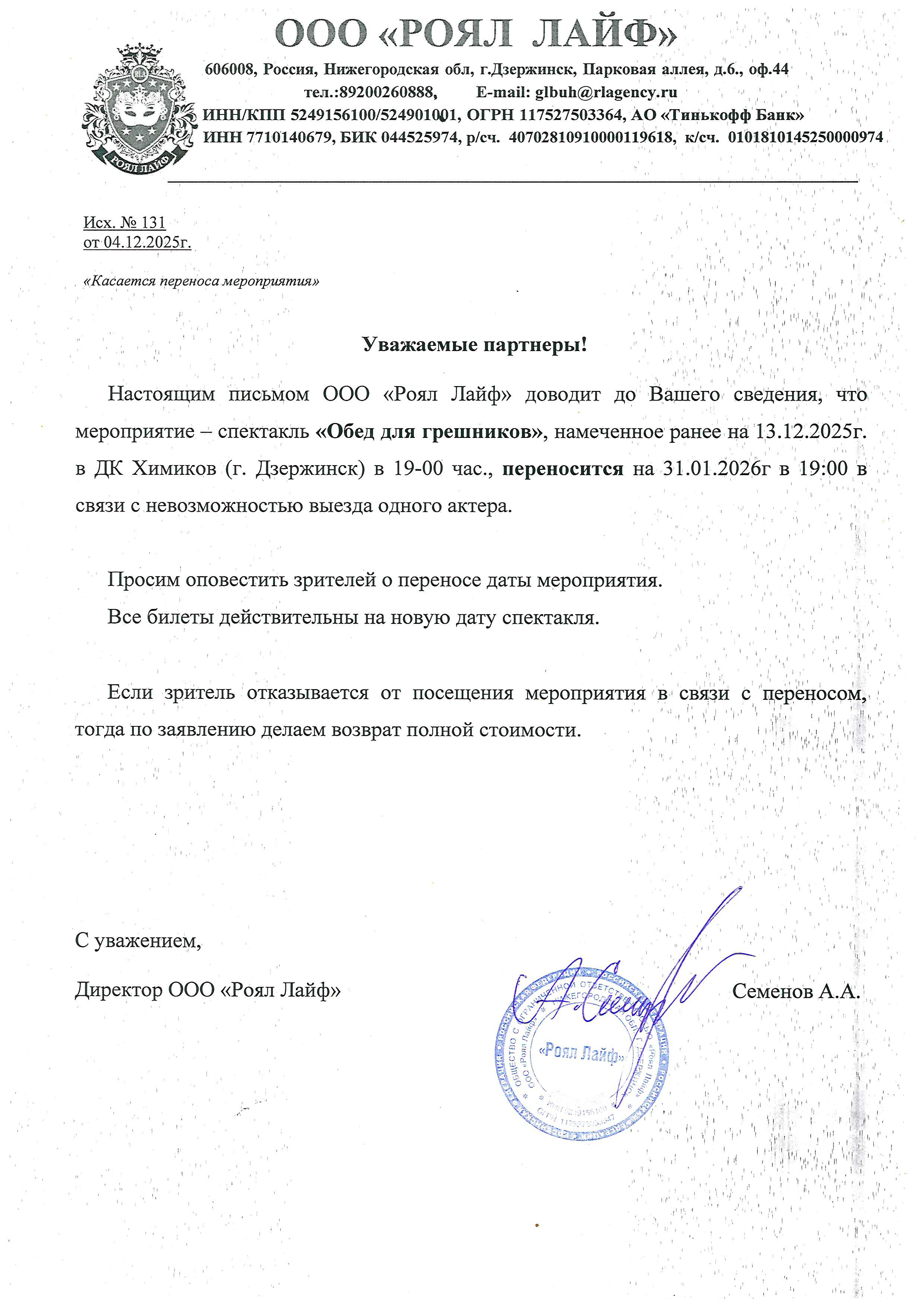 Уважаемый клиент! Спешим сообщить, что по информации, полученной от организатора, спектакль «Обед для грешников», запланированный на 13 декабря 2025 года в 19:00 в ДК Химиков, перенесен на 31 января 2026 года, начало в 19:00. Ранее приобретенные билеты действительны на новую дату, обменивать их не нужно. Если новая дата вам не подходит, вы можете вернуть билет по кнопке в личном кабинете во вкладке «Заказы». Деньги за электронные билеты вернутся автоматически в полном объёме на карту, с которой была произведена оплата. Если вы купили билет в кассе Ticketland.ru за наличный расчет, то обратитесь, пожалуйста, на почту: vozvrat@ticketland.ru. С уважением, команда поддержки Ticketland.