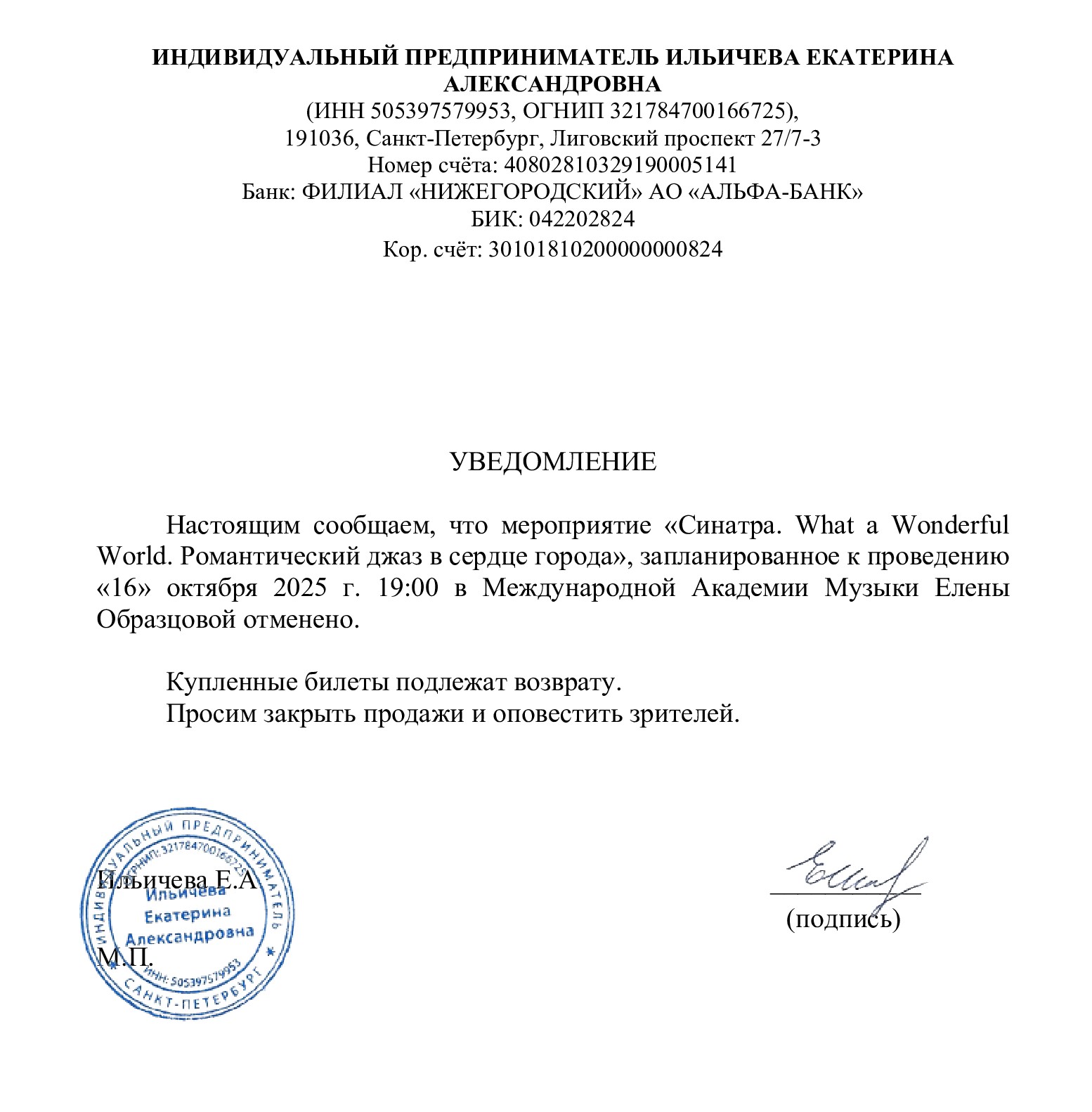 Уважаемый клиент! Спешим сообщить, что по информации, полученной от организатора, концерт «Синатра. What a Wonderful World. Романтический джаз в сердце города», запланированный на 16 октября 2025 года в 19:00 в Международной Академии Музыки Елены Образцовой, отменён. Деньги за электронные билеты вернутся автоматически в полном объёме на карту, с которой была произведена оплата. Если вы купили билет в кассе Ticketland.ru за наличный расчет, то обратитесь, пожалуйста, на почту: vozvrat@ticketland.ru. С уважением, команда поддержки Ticketland.