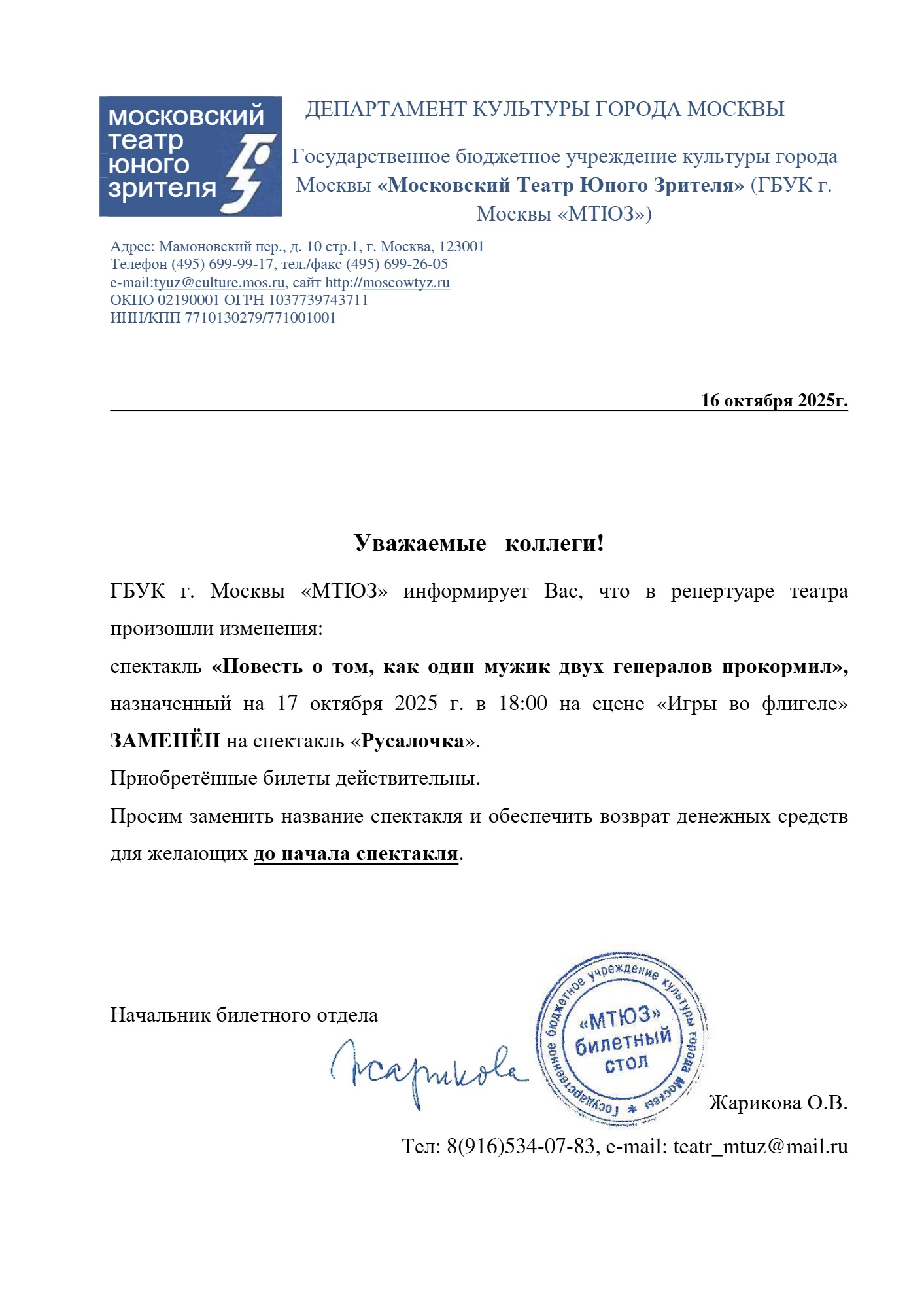 Уважаемый клиент! Спешим сообщить, что по информации, полученной от организатора, спектакль «Как один мужик двух генералов прокормил», запланированный на 17 октября 2025 года в 18:00 в МТЮЗе, заменён на спектакль «Русалочка». Ранее приобретенные билеты действительны на новое мероприятие, обменивать их не нужно. Если новое мероприятие вам не подходит, вы можете вернуть билет по кнопке в личном кабинете во вкладке «Заказы» (до 17.10.25 18:00). Деньги за электронные билеты вернутся автоматически в полном объёме на карту, с которой была произведена оплата. Если вы купили билет в кассе Ticketland.ru за наличный расчет, то обратитесь, пожалуйста, на почту: vozvrat@ticketland.ru. С уважением, команда поддержки Ticketland.