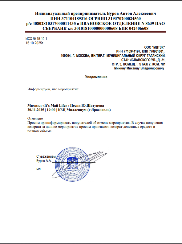 Уважаемый клиент! Спешим сообщить, что по информации, полученной от организатора, мюзикл «It's МАЙ life!», запланированный на 20.11.2025 | 19:00 | КЗЦ Миллениум, отменён. Деньги за электронные билеты вернутся автоматически в полном объёме на карту, с которой была произведена оплата. Если вы купили билет в кассе Ticketland.ru за наличный расчет, то обратитесь, пожалуйста, на почту: vozvrat@ticketland.ru. С уважением, команда поддержки Ticketland.