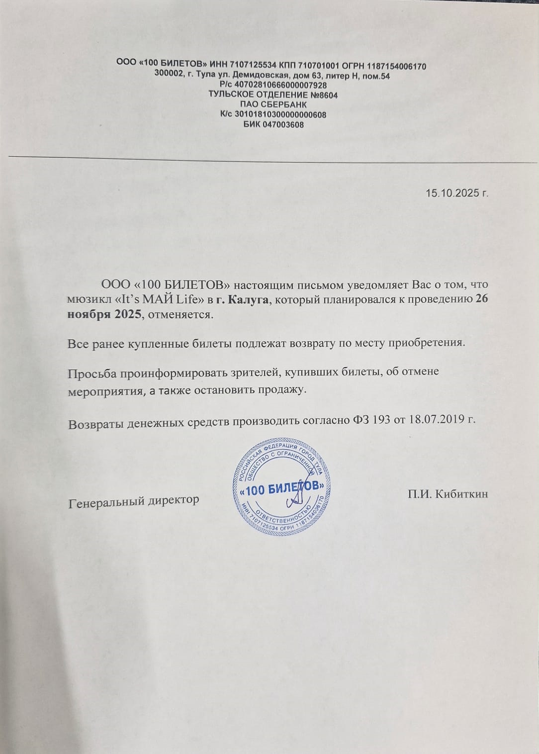 Уважаемый клиент! Спешим сообщить, что по информации, полученной от организатора, мюзикл «It's МАЙ life!», запланированный на 26 ноября 2025 года в 19:00 в ДК «КТЗ», отменён. Деньги за электронные билеты вернутся автоматически в полном объёме на карту, с которой была произведена оплата. Если вы купили билет в кассе Ticketland.ru за наличный расчет, то обратитесь, пожалуйста, на почту: vozvrat@ticketland.ru. Письмо от организатораС уважением, команда поддержки Ticketland.