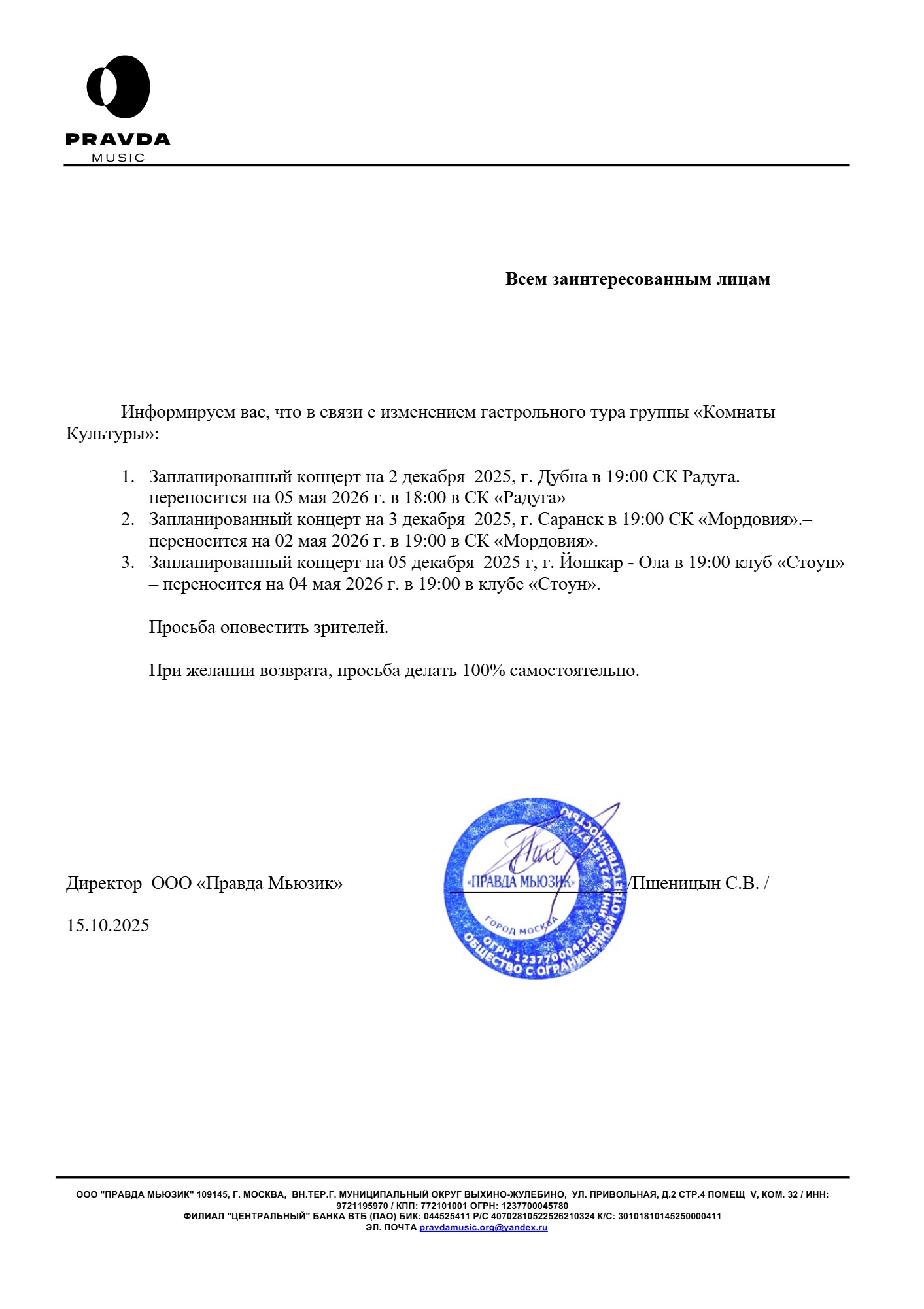 Уважаемый клиент! Спешим сообщить, что по информации, полученной от организатора, концерт группы «Комната культуры», запланированный на 3 декабря 2025 года в 19:00 в СК «Мордовия», перенесён 2 мая 2026 года, начало в 19:00. Ранее приобретенные билеты действительны на новую дату, обменивать их не нужно. Если вам не удобно посетить спектакль в новую дату, вы можете вернуть билет по кнопке в личном кабинете во вкладке «Заказы» (до 03.12.25 19:00). Деньги за электронные билеты вернутся автоматически в полном объёме на карту, с которой была произведена оплата. Если вы купили билет в кассе Ticketland.ru за наличный расчет, то обратитесь, пожалуйста, на почту: vozvrat@ticketland.ru. С уважением, команда поддержки Ticketland.
