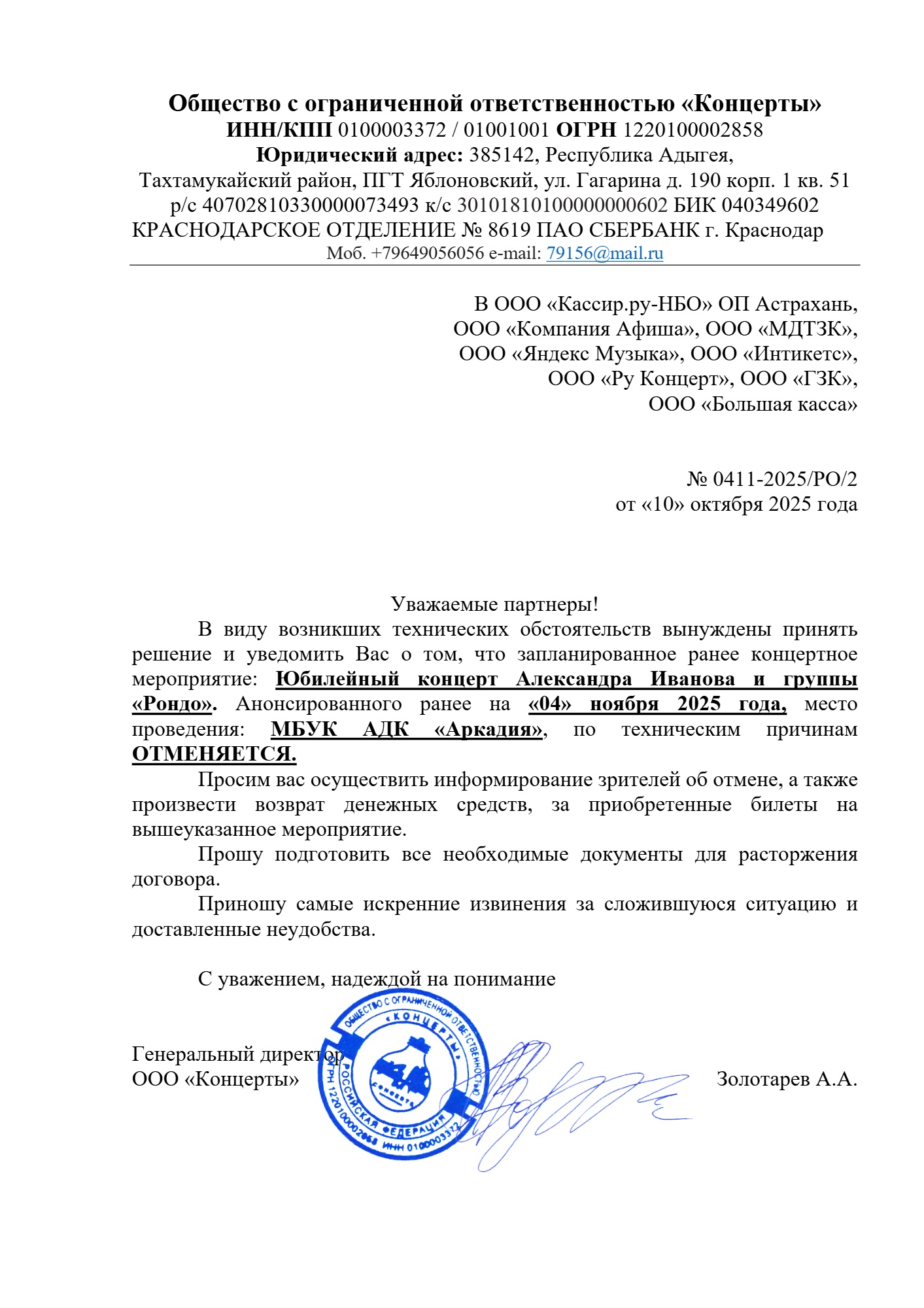 Уважаемый клиент! Спешим сообщить, что по информации, полученной от организатора, концерт Александра Иванова и группа «Рондо», запланированный на 4 ноября 2025 года в 19:00 в ДК «Аркадия», отменён. Деньги за электронные билеты вернутся автоматически в полном объёме на карту, с которой была произведена оплата. Если вы купили билет в кассе Ticketland.ru за наличный расчет, то обратитесь, пожалуйста, на почту: vozvrat@ticketland.ru. С уважением, команда поддержки Ticketland.